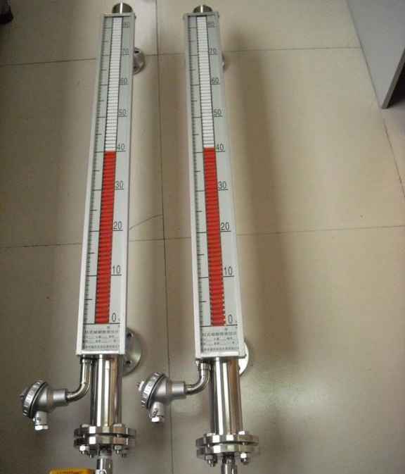 液位計(jì)根據(jù)浮力原理,浮子在測(cè)量管內(nèi)隨液位的升降而上下移動(dòng),浮子內(nèi)的永久磁鋼通過(guò)磁耦合作用,驅(qū)動(dòng)紅、白色翻柱翻轉(zhuǎn)180’液位上升時(shí),翻柱由白色轉(zhuǎn)為紅色,下降時(shí),翻柱由紅色轉(zhuǎn)為白色,從而實(shí)現(xiàn)液位的指示。