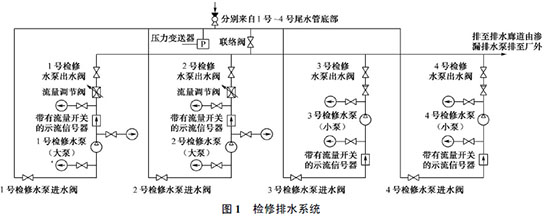 桐柏電站的檢修排水系統, 共設4 臺排水泵, 如圖1 所示, 1 號、2 號檢修水泵(大泵)用于排空引水隧洞、蝸殼、尾水管、尾水隧洞內的水;3 號、4 號檢修水泵(小泵)用于球閥、上下庫閘門等的滲漏排水。每臺檢修水泵均配置逆止閥、壓力表和帶流量開關的示流信號器, 在1 號、2 號水泵出水管處各安裝了一個流量調節閥。系統中共有2 根總管, 一根為水泵的總吸水管, 包括從每臺機組尾水管底部至總管的支管, 總吸水管和部分支管及管路上的操作閥門布置在廠房管路廊道中;另一根為總排水管, 可將水排至滲漏集水井中, 再經滲漏排水泵排至下庫。
