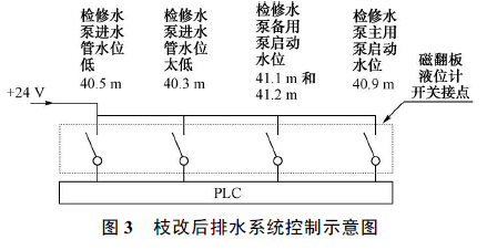 水位點40 .9 m 、41 .1 m 、41 .2 m 的開關量有上升自保持功能;水位點40 .3 m 、40 .5 m 的開關量有下降自保持的功能。技改過程中保留了壓力變送器的接線, 讓其模擬量繼續上送上位機, 只作為顯示用, 但在檢修排水系統邏輯中取消壓力變送器控制檢修水泵的啟停功能, 邏輯里增加了由浮子開關來控制檢修水泵的啟停過程。