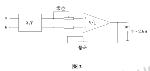 來自液位傳感器的對應液位高度的電阻信號,進入圖2所示的a,b端,經處理后*終輸出4~20mA DC標準信號。
