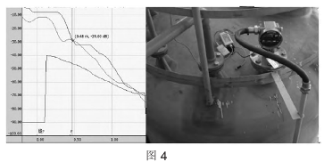 圖5為鈷礦漿化槽液位達到2.3m(量程3m)時回波包絡線圖。該液位計在投產初期一直正常使用,但經過1個月后,液位發生異常波動的情況越來越頻繁,分析回波曲線后,發現在較低的液位(2.3m)時,回波強度也比較弱(30dB)。拆下液位計檢查后發現液位計表面附著了一層黑色的礦漿,導致液位計無法正常工作。