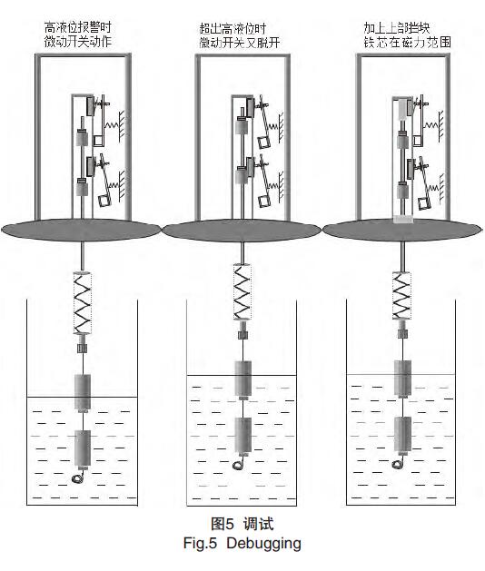 3)在調試過程中,發現液位開關沒有自保持功能,當高報警點過后,液位再往上升則高液位報警會消除,低液位時也是同樣,在分析原因后發現,鐵芯在套筒內移動的位置不當是造成不能自保持的原因,如圖5所示,于是在套筒內的鐵芯上方加一阻擋塊,使高液位超出時,鐵芯被阻擋塊擋住,不再向上移動,從而不會脫出微動開關的磁力范圍,對低液位報警的自保持是在鐵芯的下部加一個環型的墊片,阻止鐵芯向下移動超出微動開關的磁力范圍。從而提高了可靠性和重復性。接下來的調試中,又出現了一些零零碎碎的問題,如磁鐵磁性不夠,或者彈簧彈性不夠,彈簧的抗疲勞性差。元器件的材料和加工工藝不理想,出于對核電的安全性和穩定性的考慮,開始考慮使用國外公司的產品,在試用后沒有出現以上的問題,于是決定從新采購一批國外的液位開關,將有問題的液位開關更換成國外的產品。