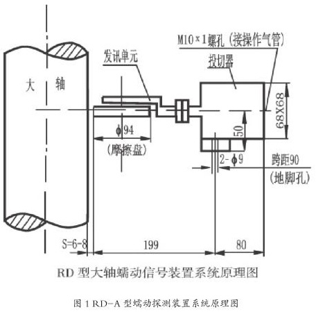 該電站蠕動探測之前主要使用的是氣動式機械蠕動裝置和電動式機械蠕動裝置,哈電機組和 VHS 機組使用的是氣動式蠕動裝置,型號為 RD-A 哈控,RD-A 型蠕動探測裝置由投切器和發(fā)訊單元兩部分組成,當(dāng)機組停機完成后通過蠕動控制電磁閥(空氣電磁閥)向投切器通入壓縮空氣,它將發(fā)訊單元向前推進,使其磨擦盤與機組大軸表面相接觸(有稍許正壓力)。如果大軸發(fā)生蠕動,轉(zhuǎn)角達到 1.5° ~2°時,發(fā)訊單元便發(fā)出大軸蠕動信號,作用于報警與制動回路,投入制動閘以防蠕動現(xiàn)象擴延。機組起動前,先動作空氣電磁閥使投切器排氣,由于彈簧力的作用,發(fā)訊單元退回原位。離開大軸表面 6 mm~8 mm,確保裝置安全。RD-A型蠕動探測裝置系統(tǒng)原理如圖1所示。RD-A型探測裝置易卡澀導(dǎo)致探測裝置投退失敗,影響開停機成功率。東電機組使用的是電動式蠕動裝置,型號為 PXJ-1D。PXJ-1D 型蠕動探測裝置多起反饋信號拒動的事件,導(dǎo)致開停機流程退出,其原因為電動式蠕動裝置控制回路與位置反饋節(jié)點取自同一個行程開關(guān),當(dāng)行程開關(guān)常閉節(jié)點斷開時,電機停止轉(zhuǎn)動,而此時可能因行程過短導(dǎo)致常開節(jié)點尚未閉合,位置信號無法正常上送至監(jiān)控系統(tǒng)。為了解決這一問題,目前電站 15 臺機組蠕動探測裝置已換型為非接觸式蠕動探測裝置,避免開停機過程中投入或退出蠕動失敗導(dǎo)致的流程退出。非接觸式蠕動探測裝置設(shè)計原理為 :