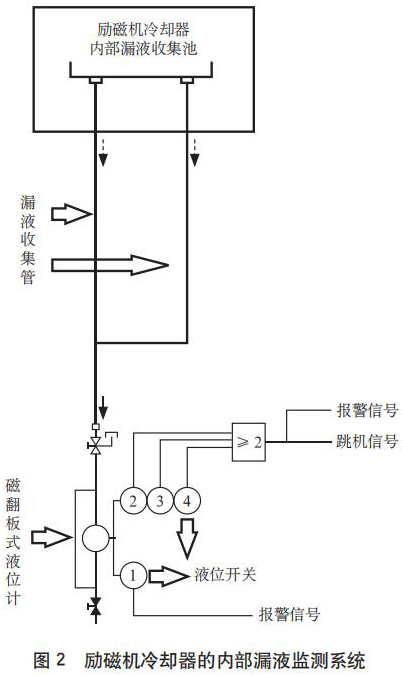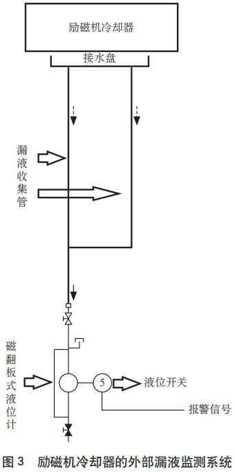 實際運行經驗表明,球罐液位計內部銅管發生泄漏的概率較低,但一旦發生泄漏,漏液會隨著冷卻空氣沿閉合風路進入勵磁機內部,造成勵磁機短路損壞的嚴重后果。為了保證機組安全,應有冷卻器內部銅管泄漏監測裝置,然而現場沒有配置此類裝置。