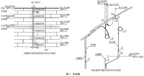 以昆侖能源華油天然氣四川廣安液化天然氣2萬方儲罐為例,在安裝多點溫度計過程中,內(nèi)罐底部溫度熱電阻需要從內(nèi)罐浮頂進(jìn)入罐內(nèi),沿罐壁垂直向下固定在罐底部。如需夾層底部溫度測量,則需要將溫度熱電阻沿外罐壁垂直而下,固定在罐底夾層的氮氣管上,每間隔4m布置1個電纜固線器,如圖1所示。