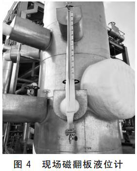 現(xiàn)場磁翻板液位計(圖4)由于儲罐壓力偏高,正常生產(chǎn)時為3MPa,導(dǎo)致磁翻版液位計浮子被壓扁。解決方法:尋找能夠生產(chǎn)耐高壓低密度液位計浮子廠家。