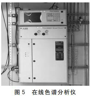 (1)利用電加熱氣化取樣探頭,把測量介質(zhì)引入在線色譜分析儀,實時分析氣體組分。在使用在線色譜分析儀(圖5)時,需要配合標(biāo)氣及載氣,提前對色譜進(jìn)行標(biāo)定。預(yù)處理部分,先把每個取樣管路取下來吹掃5~10min(取樣探頭壓力設(shè)定為2~3kg),保證沒有雜質(zhì)摻入,然后接上管線。要注意定期檢查色譜載氣(H2或者N2)使用情況,及時更換。如果更換不及時,在使用完之前,*好停用色譜,防止燒壞檢測器。