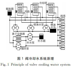 閥冷卻水系統(tǒng)主要構(gòu)成部分為閥內(nèi)冷水系統(tǒng)與閥外冷水系統(tǒng)。閥內(nèi)冷水系統(tǒng)主要通過(guò)內(nèi)冷水與閥組件直接接觸流動(dòng),將氯乙烯液位計(jì)中熱量帶出,確保氯乙烯液位計(jì)組件中晶閘管、水冷電阻、陽(yáng)*電抗器等發(fā)熱元件運(yùn)行溫度具有可控性。而閥外冷水系統(tǒng)主要通過(guò)閉式冷卻塔或風(fēng)機(jī)將內(nèi)冷水中熱量帶走,并排放至環(huán)境中。氯乙烯液位計(jì)內(nèi)、外冷水系統(tǒng)的協(xié)同運(yùn)行,可以使氯乙烯液位計(jì)組件內(nèi)部冷卻持續(xù)進(jìn)行,并滿(mǎn)足元器件結(jié)溫要求,進(jìn)而保證系統(tǒng)整體運(yùn)行穩(wěn)定性、安全性。閥冷卻水系統(tǒng)原理如圖1所示。
