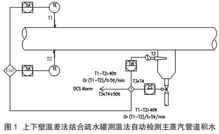 (1)主蒸汽管道積水的自動檢測與控制。推薦采用上下壁溫差法與疏水罐測溫法結(jié)合的形式,自動檢測主蒸汽管道的積水情況,不僅造價較低,還比單獨某種測量方法的可靠性要高很多,如圖 1 所示。