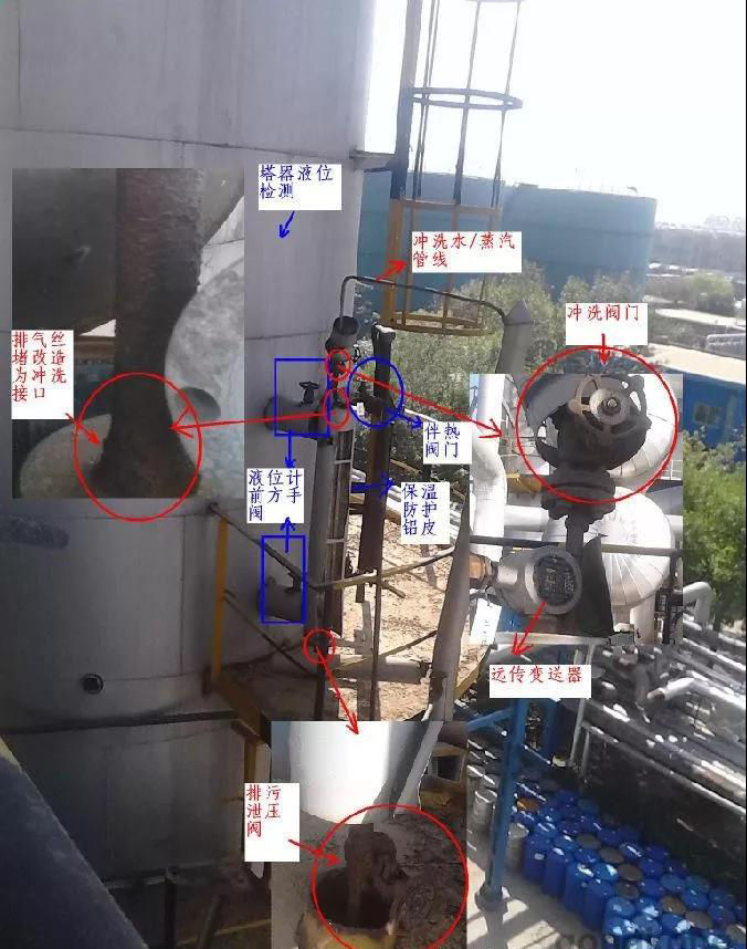 外裝式浮子液位計(jì)在實(shí)際清污中,對(duì)于現(xiàn)場(chǎng)安裝環(huán)境惡劣險(xiǎn)峻不易拆卸的情況下,進(jìn)行維護(hù)改進(jìn)。利用測(cè)量筒上部的排氣絲堵,引進(jìn)蒸汽和清水管線,可以在不拆卸磁浮子的情況下進(jìn)行一定程度的除污清洗。