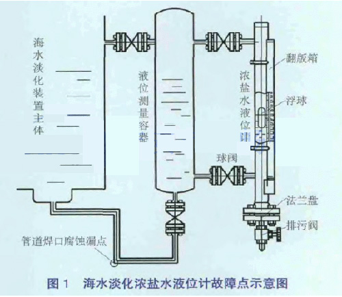 2013年12月16日0:20海淡水化裝置主體U3濃鹽水液位計(jì)開(kāi)始出現(xiàn)30%~70%的波動(dòng),檢查液位計(jì)本體無(wú)異常,將液位計(jì)上、下閥門(mén)關(guān)小后,液位測(cè)量波動(dòng)減小,但故障現(xiàn)象并未消失。利用高爐休風(fēng)機(jī)會(huì)降海水淡化U3主體負(fù)荷并查找故障原因。將液位計(jì)上、下閥門(mén)全關(guān)閉并拆下下部絲堵,打開(kāi)排污閥徹底進(jìn)行排氣排污處理,檢測(cè)磁性浮子,未發(fā)現(xiàn)異常。當(dāng)投運(yùn)后波動(dòng)現(xiàn)象存在。濃鹽水液位計(jì)更換后再次試投運(yùn),發(fā)現(xiàn)液位計(jì)液位顯示波動(dòng)更大、更頻繁。經(jīng)過(guò)排查發(fā)現(xiàn)與液位測(cè)量容器(見(jiàn)圖1)連接的管道焊接處有漏點(diǎn),對(duì)該漏點(diǎn)進(jìn)行封堵后液位測(cè)量顯示恢復(fù)穩(wěn)定,負(fù)荷狀態(tài)生產(chǎn)恢復(fù)正常。